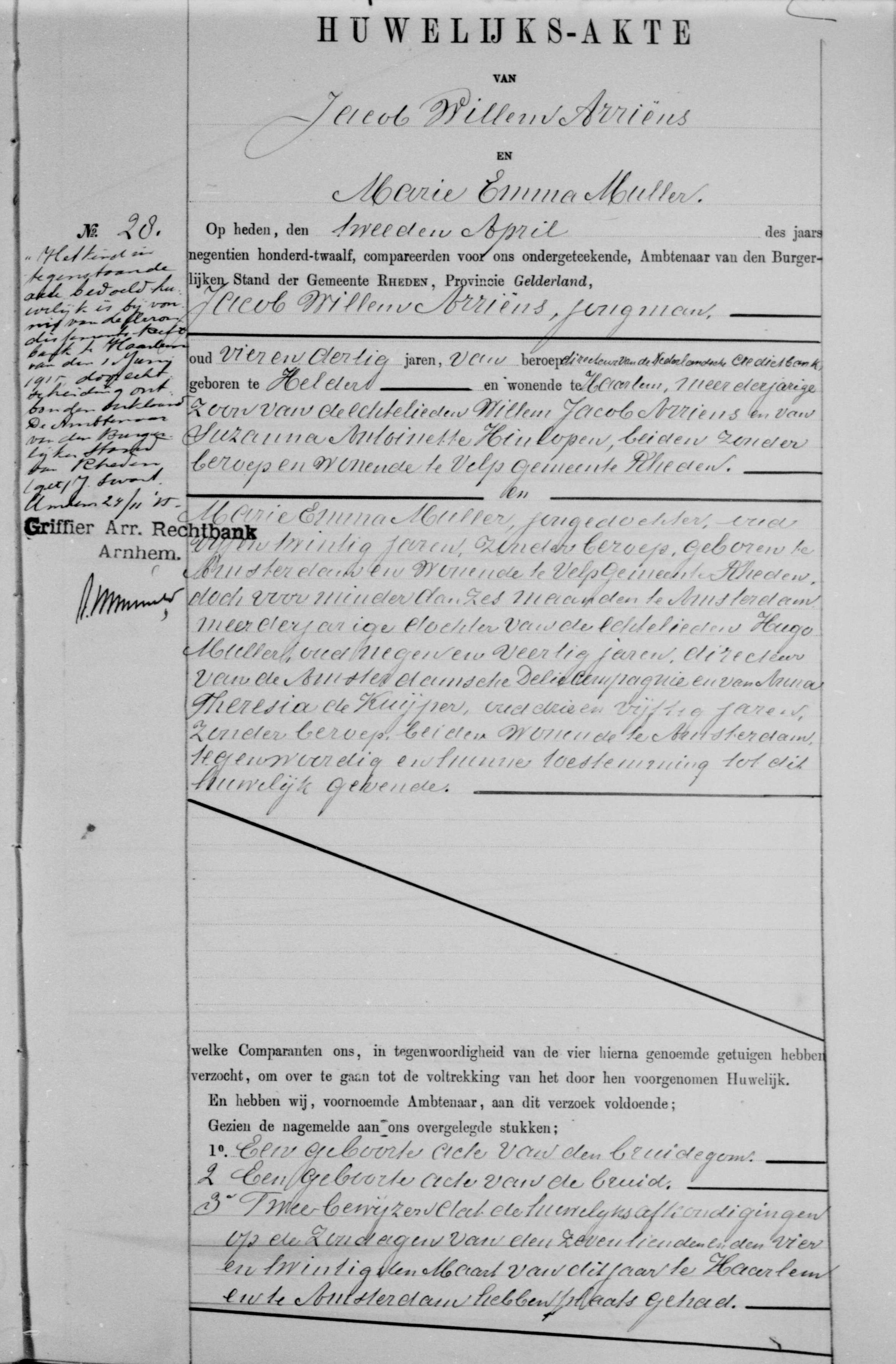 Het huwelijk werd gesloten in Rheden. Hiertoe moest één van de huwelijkskandidaten in Velp ingeschreven staan. Marie Emma was niet onbekend met Velp, haar grootouders van moeders kant hadden er van 1885 tot hun dood gewoond. Ze schreef zich in op het adres van haar (al overleden) oma. Hier woonde nu de voormalige gezelschapsdame van haar oma. Dit was op de Arnhemsestraatweg, waar een paar huizen verder ook de ouders van Wim woonden. Marie Emma werd pas op 21 februari 1912 ingeschreven. Dit werd nog fijntjes opgemerkt in de huwelijksakte. Getuigen voor Wim waren zijn vader en zijn tweelingbroer.