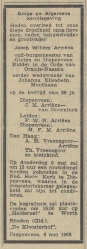 Jacob Willem Arriëns stierf 6 mei 1963. Hij werd 86 jaar.
