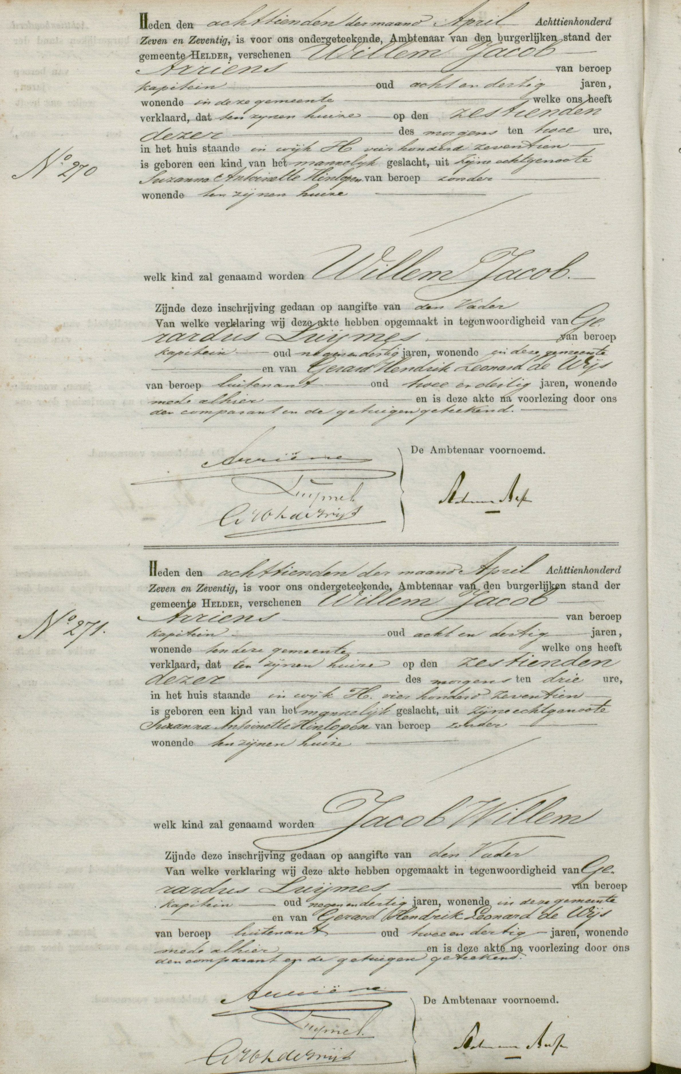 16 april 1877 werd in Den Helder de tweeling geboren. Uit het geboorte uittreksel blijkt dat Willem Jacob als eerste geboren werd en een uur later