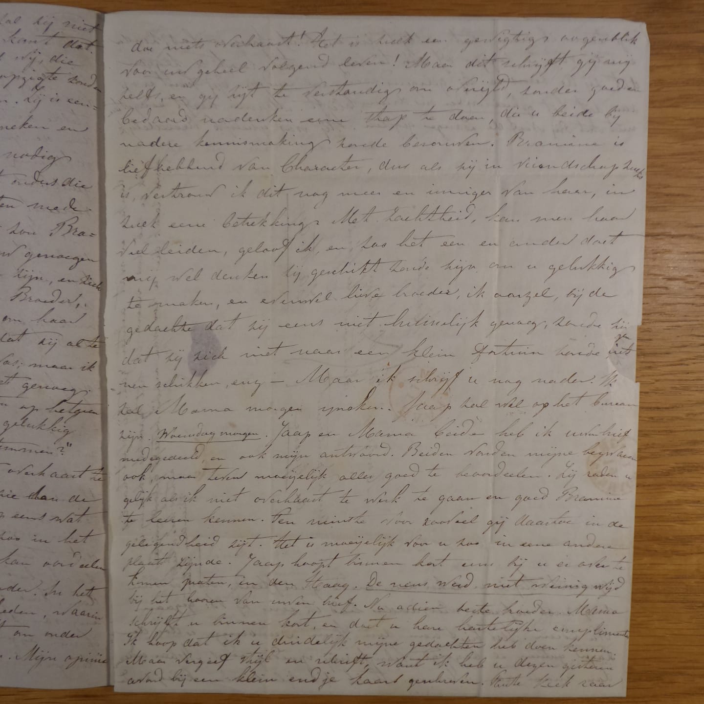schap voor u maar zonder eenig meerder gevoel. Zij denkt misschien dat gij wel weet haare liefde voor een ander, en u door vriendelijkheid wil toonen dat vriendschap voor u thans haar opregt gevoel is. wat ik u over Ida en Palland schreef Ten tweede lieve Broeder, (want fortuin, enz: staat naar mijn inzien in zóó verre op de achtergrond, dat indien dit tweede punt niet naar wensch was, de geheele zaak liever moest uit de gedachte gezet worden) ten tweede dan, lieve broeder, mijn oordeel over het character humeur enz: van Bramine. voor zoo veel als ik Bramine ken, kan ik niet zeggen of zij heeft in vele opzichten zeer lieve qualitieten Een goed humeur, zoo nu ik weet, veel openhartigheid, in het betuigen | van vriendschap: heeft zij iets tegen iemand, dan zal zij niet vriendelijk wezen en ik geloof dat het van dáár komt dat vele menschen, haar wel eens nuffig vinden. Alhoewel wij, die haar zóóveel zien, en dat ook wel eens ten onzen opzigte zouden gemerkt hebben, nooit daar hinder van hadden. Zij is eenvoudig, zelfs soms nog kinderachtig, in haar spreken en smaken. Ik geloof echter dat zij veel leiding nodig heeft. En daar zij leeft in eene kring en met ouders die alles bijwonen en alle partijen en amusementen mede doen, zoo komt bij mij de vrees wel eens op: zou Bramine in het huisselijke leven, waar gij uw genoegen zoo zeer in zoudt zoeken, wel altoos tevreden zijn, en zich in kunnen schikken? Ik kom er vooruit, waaarde Broeder, ik ken haar niet genoeg, van deze zijde om haar te beoordeelen. Het kwam mij wel eens voor, dat zij al te veel altoos van toilette en pleizier vervuld was; maar ik zeg: ik ken haar eigentlijk op dat punt niet genoeg spreek ik haar nu, dan zoude ik meer letten op hetgeen zij zeide, en altoos er bij denken "Zou dit Jan gelukkig kunnen maken?" "Zouden zij dáárin overeenstemmen?" Wat ik u raden zou, lieve Jan, is dit: niet overhaast te werk te gaan. Zijt gij eens weder met haar, zie dan de conversatie eens meer bepaald te brengen op eens wat zaken van meer gewigt dan de conversties zoo in het algemeen zijn, waarvan men zoo weinig kan oordeelen over de wijze van denken, over het een en ander.In het huwelijk dunk mij, zijn zoo vele omstandigheden, waarin men troost, leiding, raad en liefde behoeft om onder vóór en tegenspoed, alles voor elkander te zijn. Mijn opinie | is altoos, dat het niet nodig is, die geextalteerde liefde te gevoelen, die toch geen stand kan houden. Maar men moet zich boven allen verkiezen, zal de genegenheid duurzaam zijn, in het huwelijk. Houd gij zoo veel van haar en vooral hebt gij zoo veel achting voor haar, als nodig zal wezen om haar met hare gebreken die zij natuurlijk zal hebben zoo als wij allen, lief te hebben, dan geloof ik geenszinds dat ik het u kan afraden. Maar ik zeg u nogmaals, ik ben bang zelve haar niet genoeg te kennen. Wat aangaat ten derde, uwe vraag of zij u zoude kunnen liefhebben? Ja, wat zal ik u zeggen. Zij zoowel als mr: en Mev: spreken altoos met veel vriendschap van u, en ik zie daar zoo veel vóór als tegen. Vóór, dat gij zegt, zoo veel mogelijk haar oplettendheid te hebben bewezen en zij altoos weer lief en vriendelijk blijft. Indien zij niet coquette is dat ik niet de minste rede heb om te denken. waarom zoude zij dan toonen dat het haar niet onaangenaam is? Tegen dat ik geloof, zij lang en veel van Willem Valkenburg heeft gehouden en zoo ik altoos in de waan verkeerde nog van hield. Evenwel, heeft zij mij nooit daarover een woord gesproken, dus ik weet het niet. Ik vind zeer goed, dat gij niet de L: hebt geschreven, maar als ik u iets raden mag, dan zoude ik hem voor het oogenblik bedanken, voor zijne offerte nu er de ouders over te spreken. Hij is bemoeijallig en zoude door al te groote dienstvaardigheid misschien alles bederven. Zijt gij eenmaal (dat dunkt mij, voor eenen heer niet moeijelijk is, om zonder déclaratie precies te weten of een meijsje u lief heeft) Zijt gij eenmaal van hare genegenheid overtuigd, dan kunt gij immers nog Neef verzoeken onder de hand met de ouders te spreken. | het fortuin is zeker een groot bezwaar. Maar daar zij een eenig kind is en indien Bramine, zóóveel van u houd, om standvastig vol te houden dan zullen hare ouders dunkt mij haar geluk bedoelen en liever bij hun leven, daar het hun eenigst kind is, haar geluk verzekeren. Maar nog eene zwarigheid doet er zich voor u op: En dit is: of Bramine zoo wil als hare ouders er zullen kunnen toebesluiten om van elkander af te gaan? En dikwijls zoo ver, als uwe stand en carrière mede brengen? Maar deze moeijelijkheden, indien gij haar hartelijk lief hebt en zij wederkeerig u, en indien gij genoeg overeenkomst hebt om alles met elkander te deelen in de toekomst, alle deze moeijelijkheden zijn dunkt mij over te komen. Ik zal, volgens uw verlangen morgen Mama en Jaap uwen brief mededeelen ik had zoo gaarne deze heden al verzonden, maar dit kon niet meer. Nu gaan wij morgen naar Haarlem en zal hem dan op de post doen. Spoedig schrijf ik u dan weder. Mama zeker ook. Gij zult geene aangenaame tijd doorbrengen. Wat mij aangaat ik houd veel van Bramine en daar zij, van de eerste dag onzer kennismaking af, altoos zeer hartelijk en lief voor ons was, heb ik altoos haar gaarne gezien. Evenwel ik herhaal het, haar karakter en wijze van denken in vele opzichten nooit zóó zien te ontdekken als ik zeker zoude gedaan hebben als ik had kunnen voorzien dat uw geluk er mede in verband stond. Jammer dat zij nu maar zoo kort in den Haag is geweest. Gij zijt zoo als gij zelfs zegt zoo weinig in de gelegenheid om haar eens te zien zoodanig en eens eigentlijk elkàar te leeren kennen. Ik herhaal nog eens lieve broeder | doe niets overhaast! Het is zulk een gewigtig oogenblik voor uw geheel volgend leven! Maar dit schrijft gij mij zelfs, en gij zijt te verstandig om overijld, zonder goed en bedaard nadenken eene stap te doen, die u beide bij nadere kennismaking zoude berouwen. Bramine is liefhebbend van character, dus als zij in vriendschap zul