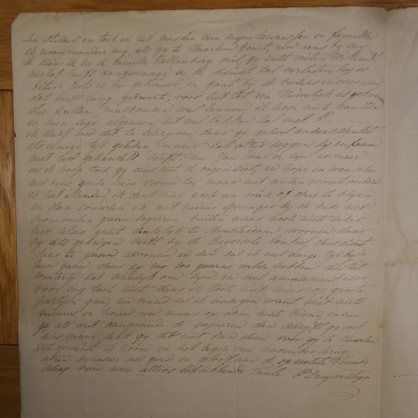 daar zijne E. noch méer inlichting vroeg, nopéns de famille, dus dacht ik het best was, dit aan uw te vragen, daar gij toch al die papieren wéet, en naziet. Doe mij dat genoegen dit eéns goed na te zien, en antwoord mij daar eéns op, of zouwde papa die misschien aan de famille van Tuijll te Haarlem noch zelfs overhandigt hebben maar dan zouwde men er hier wel wat van wéten: niet: nu beste vriend dit zult gij wel eéns onderzoeken: hope gij welvarende zijt: en uw goed amuseert: nieuws heb ik niet mede gebracht: alles wel te Haarlem; misschien zult gij de famille van Hasselt noch wel gezien hebben zij hebben bij mevr Janssens gelogeert: zij vertrekken allen van daag naar Maastricht. hebben een lang séjour bij de Lange gemaakt. Cateau en van Doorninck logéeren daar ook, want hun hôtel is noch niet klaar zij hebben appartementen, gehuurt bij Merlin in de st Jansstraat over het gouvernement en dit is geheel nieuw opgebouwd. zij koomen er deze maand, op: het moest zeér lief wézen. gij weét misschien zij in de douce attente is van mamaatje te worden: dat komt niet van ... vriend Jan, ik ben nu ook verhuisd, en woon. zéer naar ... | Den: Helder en toch in het midden van mijne kennissen en famille. Ik recommandeer mij, als gij te Haarlem komt, uwe eens bij mij te zien: ik zie de famille Valkenburg veél, gij zult wéten Willem V: verlof heeft aangevraagd, en de dienst zal verlaten, hij is béter: Frits is nu getrouwd, en gaat bij de ouders in woonen, dat heeft lang geduurt:, voor het tot een huwelijk is gekoomen die zullen malkander wel kennen ik hoor niets van Ida en men zegd algemeen het wel lukken zal met P:-- Ik durf uw dit te schrijven, daar gij geheel anders denkt als eénige tijd geleden, maar zal altijd zeggen zij infaam met uw gehandeld heéft: nu Jan daar er zijn er meer.en ik hoop toch gij eéns uit de oogen ziet, en hope en wenschen uw eene, goede lieve vrouw toe, maar met centen want anders is het ellende, ik denk hier noch een weék of drie te blijven en dan zouwden ik met Mimi Sprenger bij de oude mev: Crommelin gaan logeéren buiten maar noch niet zeker. Mev: Ulses. gaat denkelijk te Amsterdam woonen: daar hij iets gekrégen heeft bij de Beijersche Conseel dus dient daar te gaan woonen, en dan zal ik wel eenige tijd bij hun gaan: daar zij mij zoo gaarne wilde hebben: dus het wintertje zal schielijk om zijn: en veel amusement is er voor mij toch niet daar ik toch niet méer op groote partijen gaa, nu vriend zal ik eindigen want weét niets nieuws, en houw nu maar op: adieu beste vriend, indien gij iets weet aangaande de papieren dan schrijft gij wel eéns maar denk gij dit niet kan doen voor gij te Haarlem zijt geweest: ik komd in het begin van november terug: adieu: amuseer uw goed: en geloof aan de oprechte vriendschap van uwe altoos liefhebbende Tante P: Druijvesteijn
