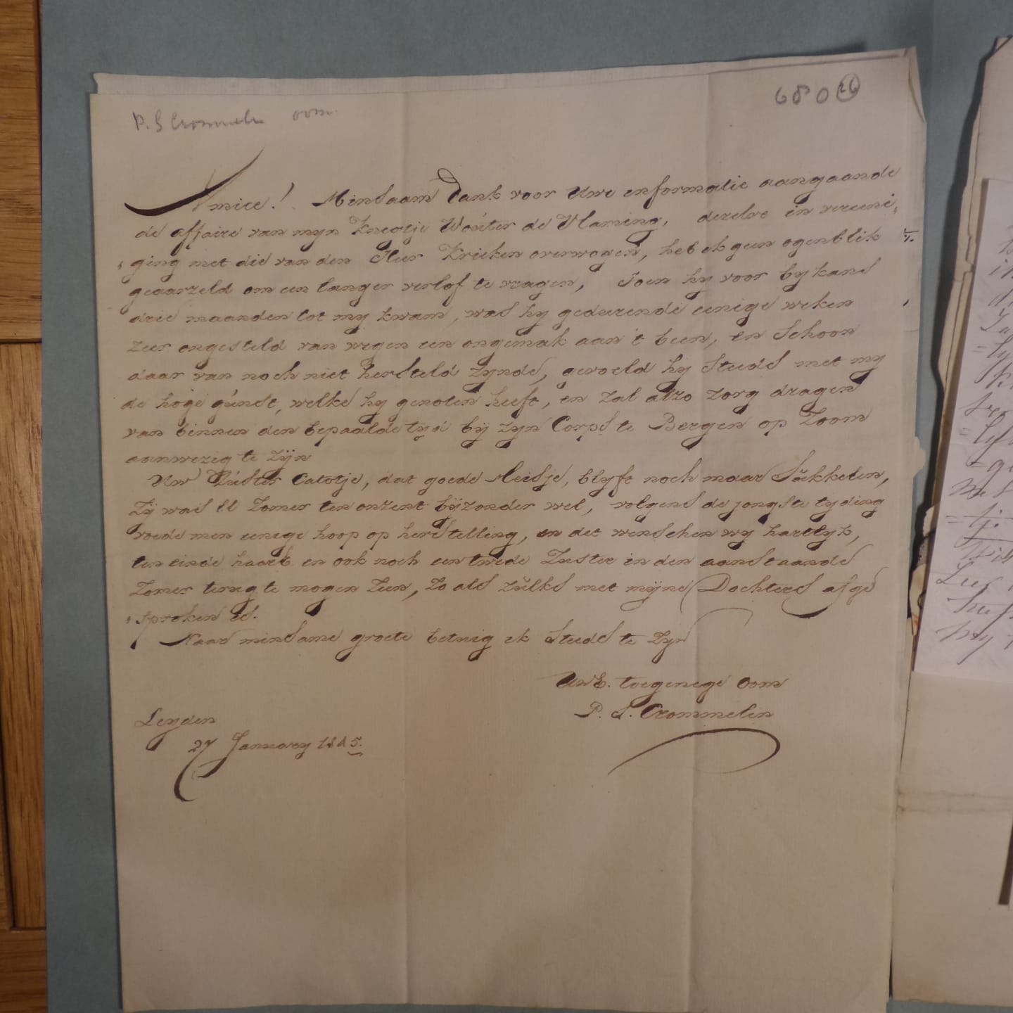 27 januari 1845. Brief van oom Pieter Samuel Crommelin uit Leiden. Wouter de Vlaming was huisbediende en stierf twee jaar later, 23 jaar jong. Cateau is in de winter van 1844 blijkbaar flink ziek geworden.