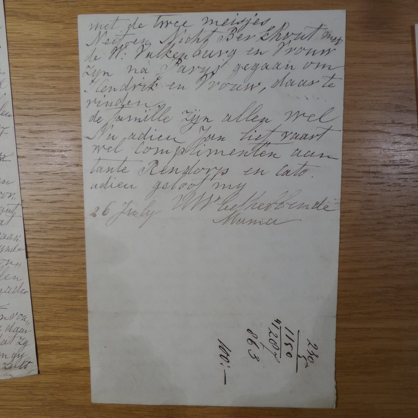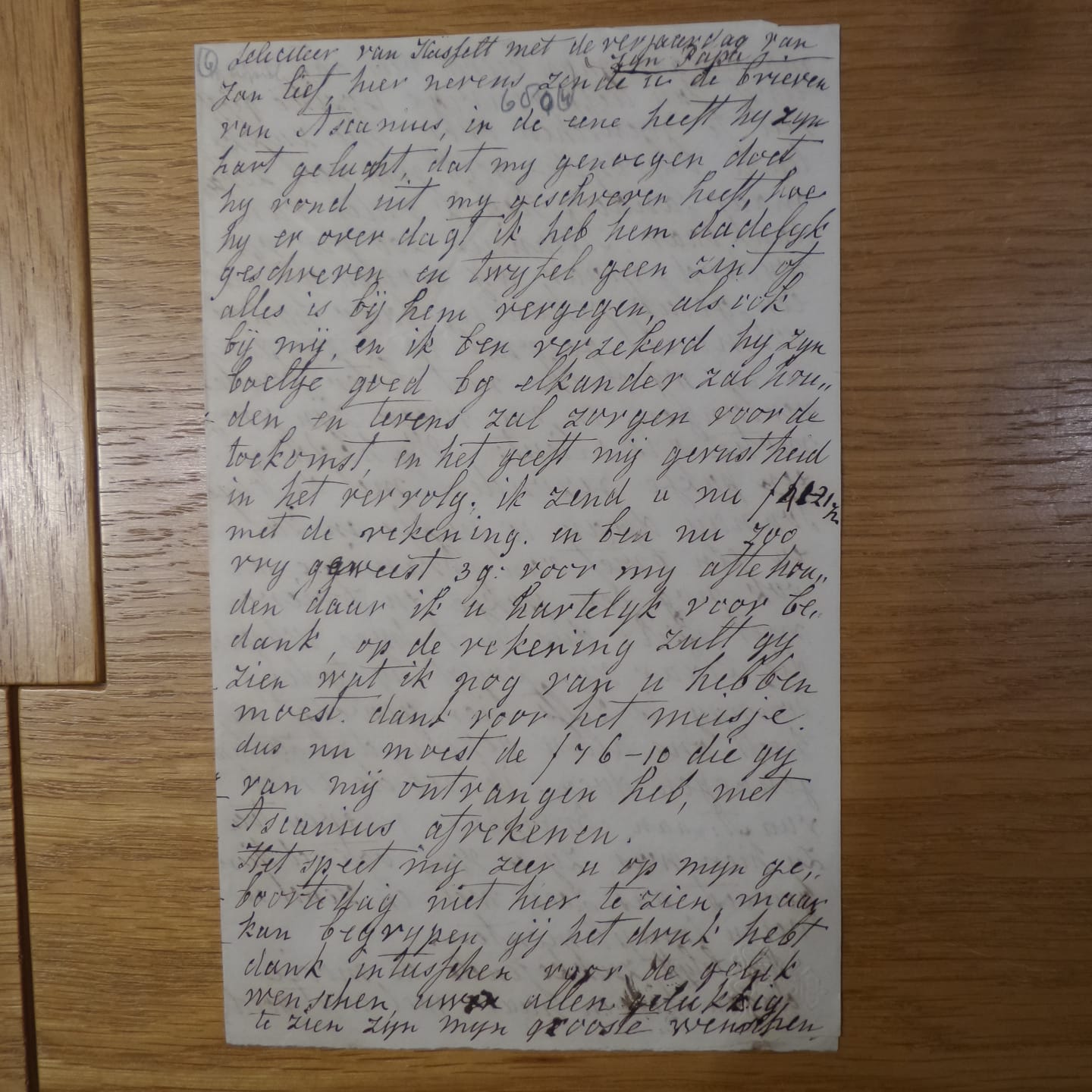 bij mij, en ik ben verzekerd hij zijn boeltje goed bij elkander zal houden en tevens zal zorgen voor de toekomst, en het geeft mij gerustheid in het vervolg. ik zend u nu f 4.21 met de rekening. en ben nu zoo vrij geweest 39: voor mij aftehouden daar ik u hartelijk voor bedank, op de rekening zult gij zien wat ik nog van u hebben moest. dank voor het meisje. dus nu moest de f 76-10 die gij van mij ontvangen heb, met Ascanius afrekenen. Het speet mij zeer u op mijn geboortedag niet hier te zien, maar kan begrijpen gij het druk hebt dank intusschen voor de geluk wenschen, uw allen gelukkig te zien zijn mijn grooste wenschen | maar daar mankeerd veel aan voor eerst Jan lief, u treurige positie geeft veel te wenschen over Mie zukkelende blijvende geeft mij veel zorgen maar anders heb ik reden van