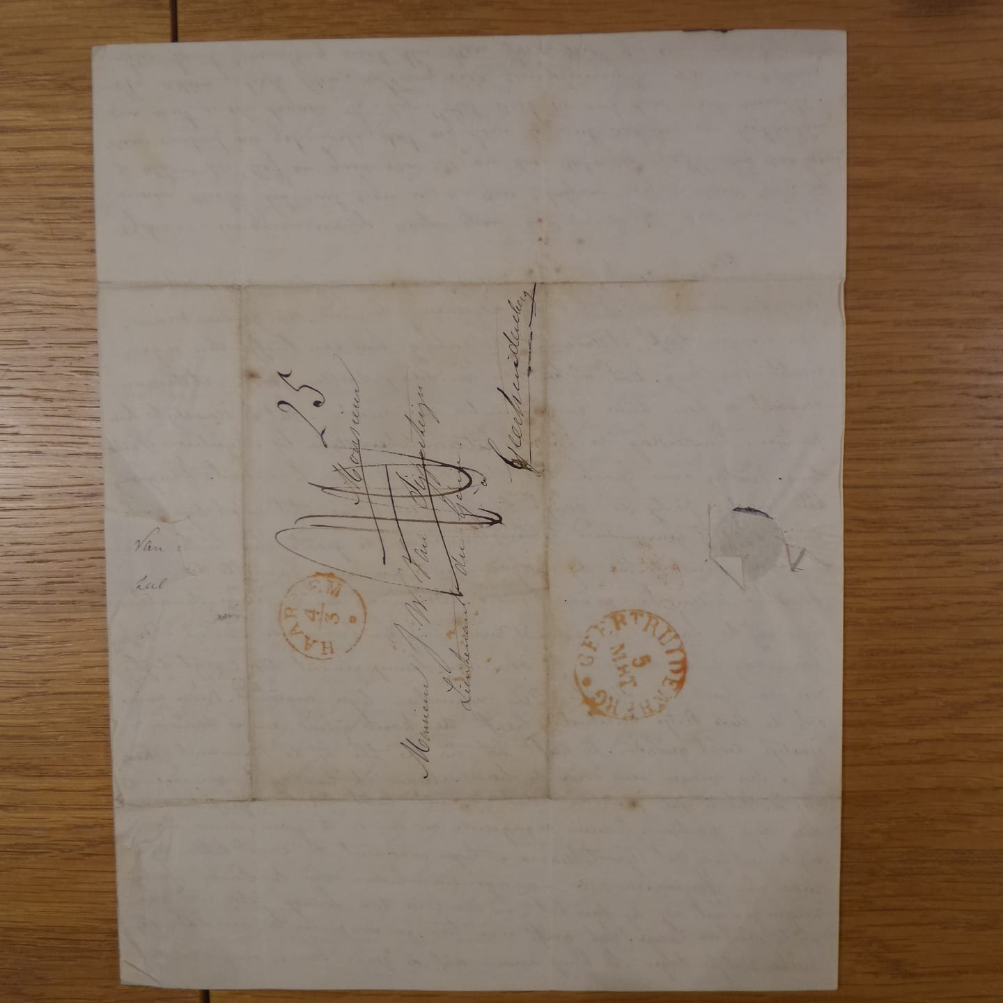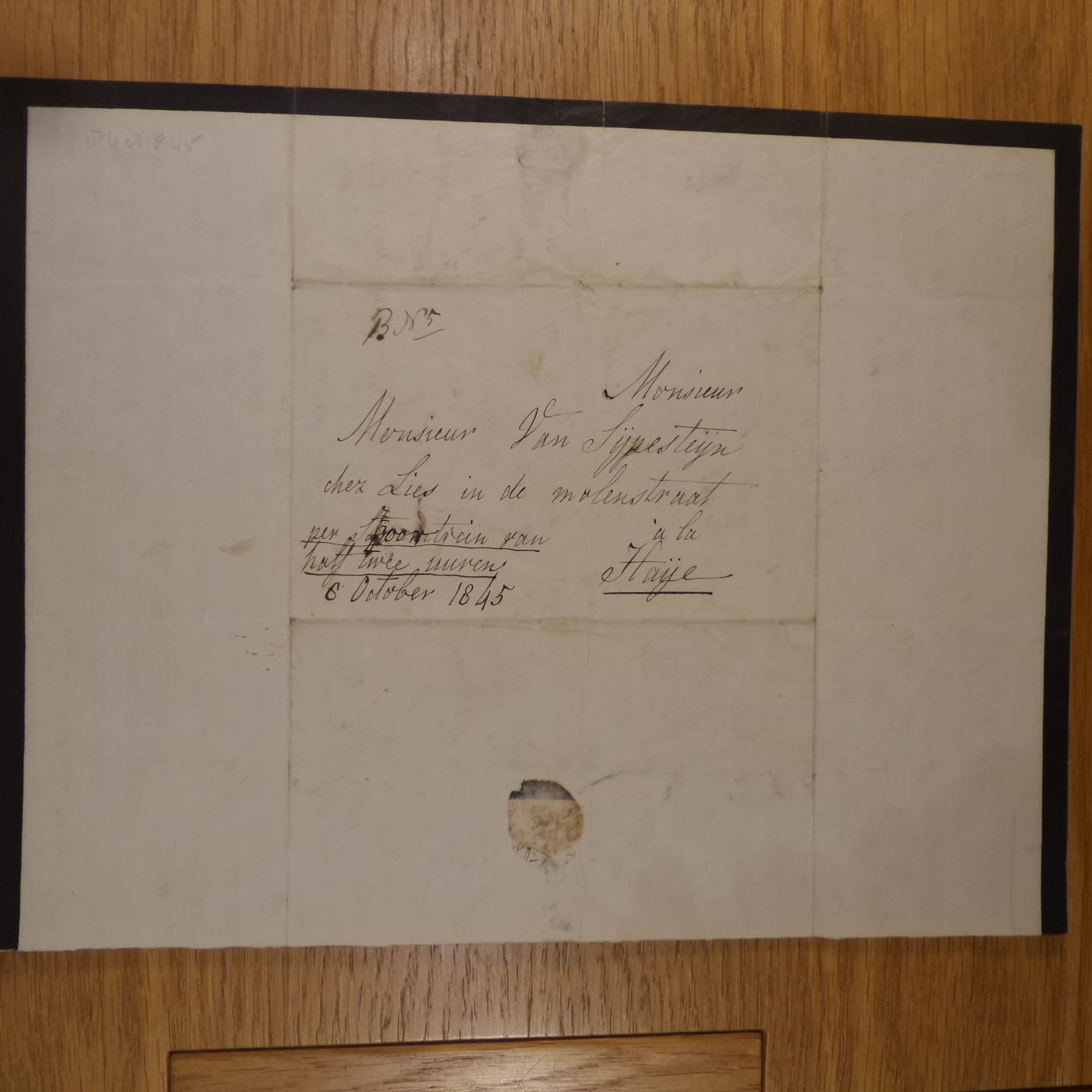 Envelop: Monsieur Van Sijpesteijn chez Lies in de molenstraat à la Haije per spoortrein van half twee uuren 8 october 1845