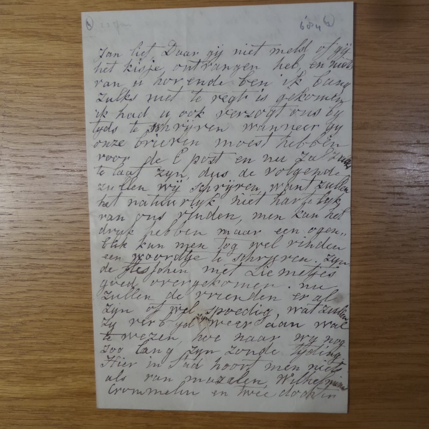 Jan lief, Daar gij niet meld of gij het kisje ontvangen heb, en niets van u horende ben ik bang zulks niet te regt is gekomen ik had u ook verzogt ons bij tijds te schrijven wanneer gij onze brieven moest hebben voor de E post en nu zal zulks te laat zijn, dus de volgende zullen wij schrijven, want zullen het natuurlijk niet hartelijk van ons vinden, men kan het druk hebben maar een ogenblik kan men tog wel vinden een woordje te schrijven. zijn de flesschen met die metjes goed overgekomen. nu zullen de vrienden er al zijn of wel spoedig, wat zullen zij verblijd zijn weer aan wal te wezen, hoe naar wij nog zoo lang zijn zonde tijding.