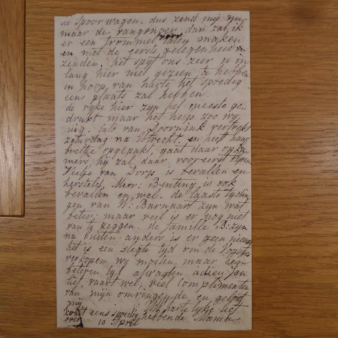 Na deeze week gaan wij naar Meerenberg dus ik hoop dat gij voor die tijd nog eens over zal komen, van de week heb | ik plan een kisje met BA: te verzenden indien gij nog iets hebt, zend het mij dan Wij zijn allen wel de kermis is hier zeer druk geweest Mie is vrijdag terug gekomen de famille wel verlaten. Nieuw is hier de zieken van de maselen zijn allen hersteld bij Utenhoven is er bij drie gebleven Nu adieu Jan lief Complimenten van Jaap en deZusters, wij zijn rasend