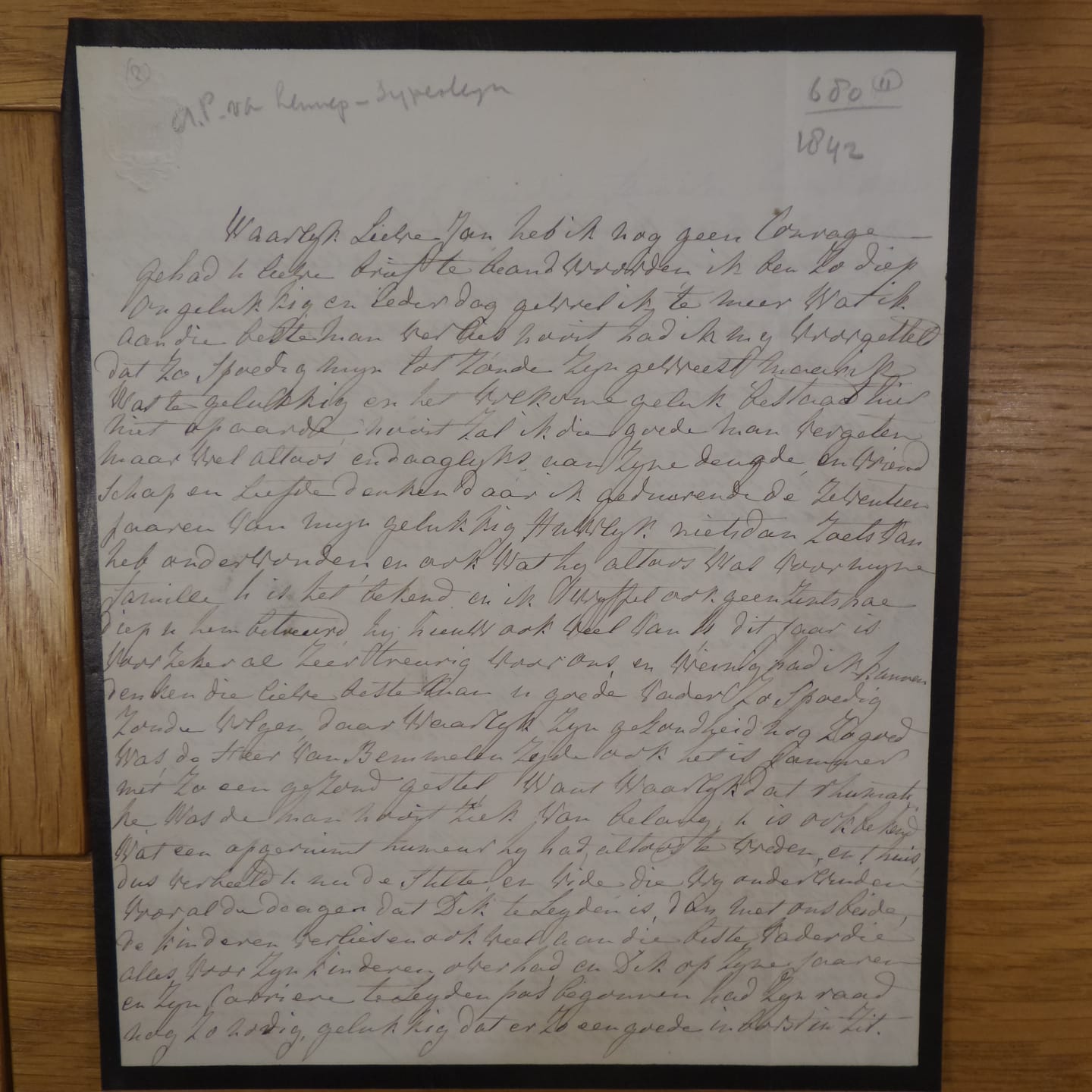 heb bij mama, de dag voor mijn vertrek gegéten Cateau en Ant zijn naar oom Crommelin te Leijerdorp. dus heeft mama het stil met Ant en Jaap.Nu koom ik uw uit naam van freûle Cornélie van Tuijll vragen: die zeer veel famille zwak heeft: of in de papieren van uw vader. niet zijn papieren van de famille van Tuijll daar papa belooft had aan de Heér van Tuijll bij zijn levén de genéalogie van zijn Edele in order te maken en zelfs héeft zij noch brieven van uw vader aan haar vader