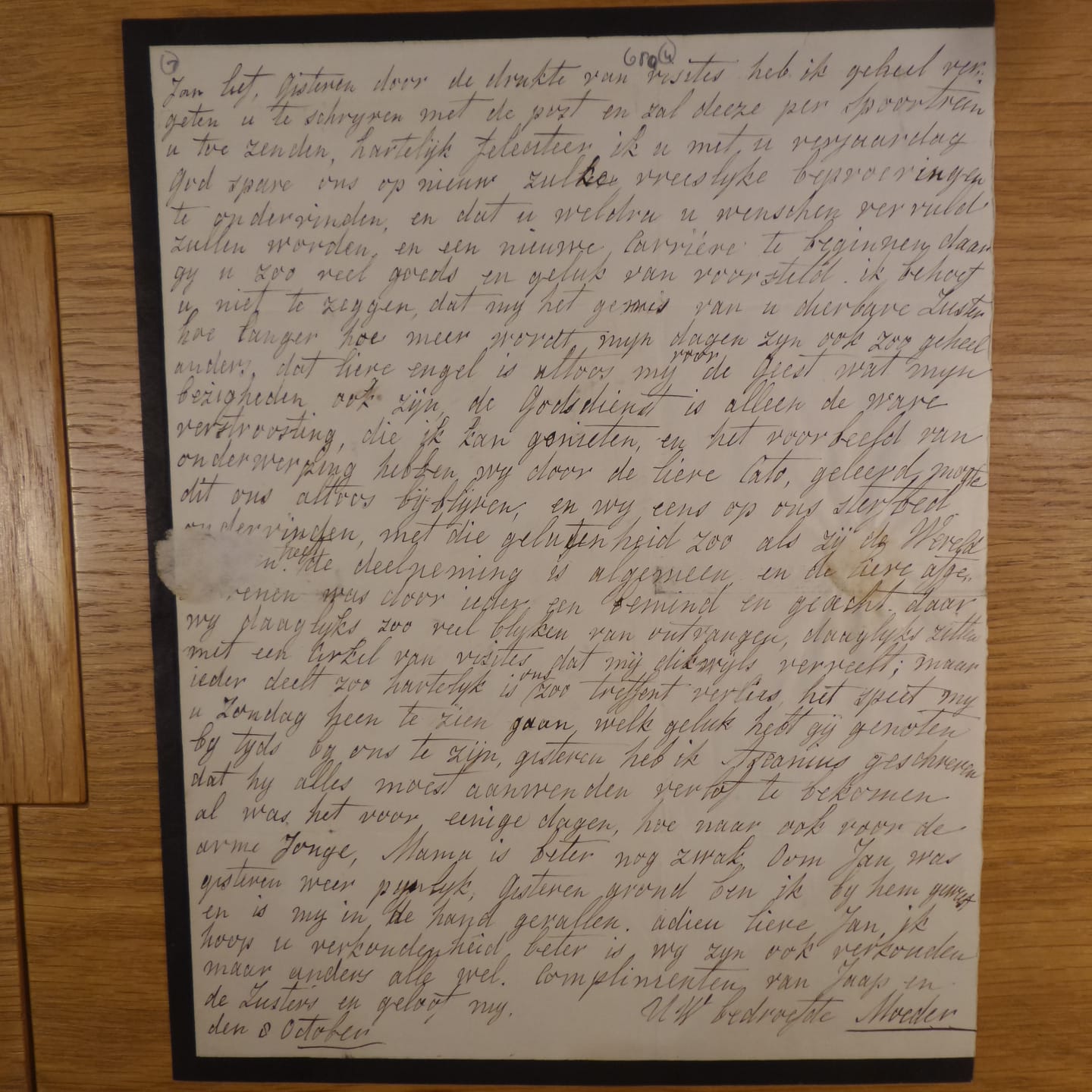 Beste Jan! Reikhalzend zagen wij uit naar de mail om nadere details over de dood van onze beste Mama, zoodat wij eenige dagen gedupeerd waren, want hij kwam zeer laat aan. Uit de brieven van de zusters hebben wij alles gezien, hoe de loop der ziekte is geweest en hoe spoedig haar dierbaar leven eindigde. Het is mij nog een droom en ik kan het mij nog maar bijna niet voorstellen. Het verheugde mij zeer uit uwe brief de heugchelijke tijding van uw engagement te