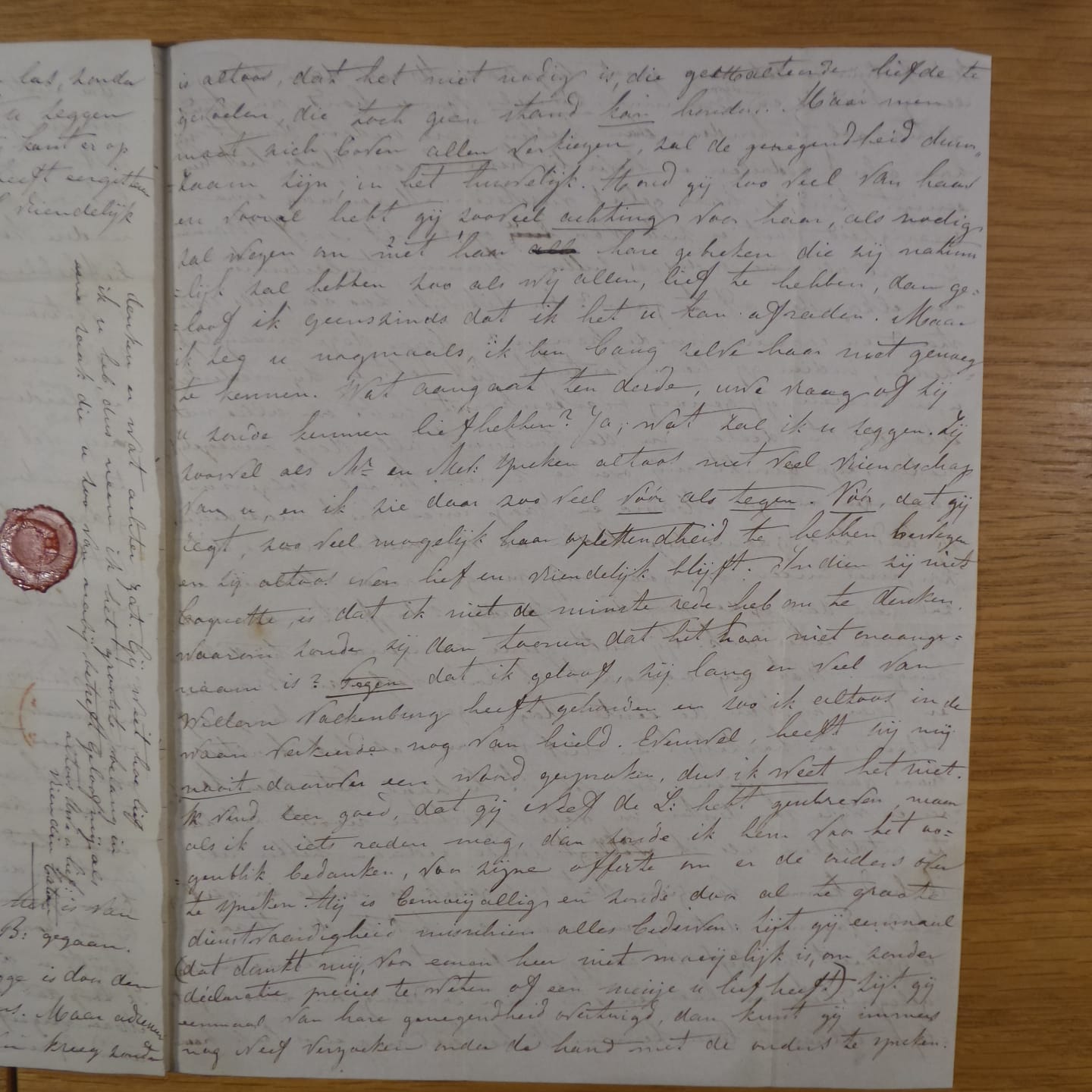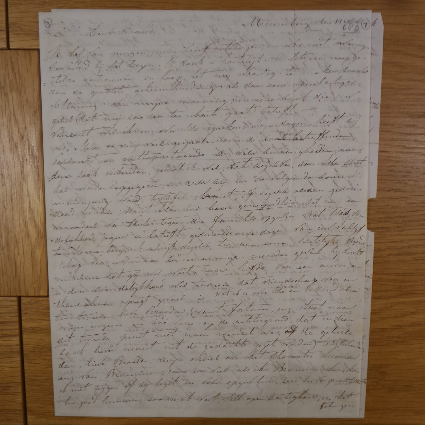Je prends la penne pour m'entretenir un peu avec vous, et vous tenir un peu au courant de ce qui se passe à Haarlem. Je pense bien que vous y serez content en pensée et que vous regretterez des fois, à Geertruidenberg òu vous n'avez aucun agrément, le plaisir dont vous avez joui durant votre séjour à Haarlem. Je puis vous assurer, qu'en ne vous a pas oublié non plus ici. Car à tout moment c'en me demande de vos nouvelles, et l'on regrette que vous ne .... éte en garnizon ici. La famille Abbema, m'a demandé de vous faire leurs compliment. Ils continnuent toujjours de nous demander à tous moment. Nous jouissons tous d'une bonne santé; mais cependant j'ai à vous communiquer quelque chose qui vous fera de la peine. C'est que hier, à l'impreviste notre bien oncle van Lennep a eu une attaque d'apapleuie. Il est assez lieu maintenant; mais on ne sait jamais si cela ne se repetera pas. Il était seul dans sa chambre hier. Ida avait thé. auprès de lui un quart d'heure ...parasant. Lucas entra par hazard et le trouva par terre. Il était tombé. De nuite on appela Ida, et Tante qui était chez Grand Maman; Monsieur Van Bemmelen ordonnia une saignée (=aderlating), et il reprit | très bien ....... ; maar zijne spraak was belemmerd, en men kan hem bijna niet verstaan.Van Bemmelen was zeer bang voor eene tweede attaque in den nacht. Maar gelukkig is dit niet gebeurd. Hij is nog al redelijk. Maar begrijpt zeer goed zelfs dat het eene beroerte is geweest. Maar stelt. zich hij zich van deze staat nog wel zal herstellen, maar het blijft zoo iets angstigs, en ieder oogenblik kan het zich herhalen. Het spijt ons allen vreeselijk van dien besten braven man! Ik ben zeker het u ook veel zwaarte zal doen. Tante, en Ida en Dik zijn zeer naar dat begrijpt gij. Dik was te Leijden; is dadelijk gehaald. Het geeft eene droevige stoornis in de vreugde dezer dagen; want want met het huwelijk van Ceetje B: zijn er alle dagen partijen. Dingsdag zoude het bal bij hun geweest zijn. Dat is natuurlijk afgezegd. Het spijt mij zeer, van dien goeden man. Zijn linkerhand is wat geraakt. Hij heeft er niets geen kracht in. En zijne trekken moeten ijselijk naar zijn. Zeer stil moet hij gehouden worden en er mag niemand bij komen. Wat een vreeselijke slag zoude dat wezen voor tante! Van Bemmelen kwijt zich wel geloof ik dat dit nog teregt zal komen; maar het is zoo akelig voor het vervolg. De vorige avond is hij geweest bij Neef Berkhout op eene groote thé, daar het zeer warm moet geweest zijn. Dit kan het wel gaande | gemaakt hebben. Maar hij was s' morgens nog heel wel; iedereen is er zeer naar over. Ook is hij algemeen bemint, die goede man. Van morgen heeft Adriaan Valkenburg hier een briefje van u gebracht voor Jaap. Dat wij hem van middag zullen geven. Adriaan verzocht u zeer zijne complimenten te maken. Het is dagelijks hier partijen. Donderdag de 24 was het aantekendiné bij mijnheer Valkenburg. Vrijdag eene groote thé dansant bij oom Barnaart. Dingsdag een jongelui partij en soupé bij Jan Piet.