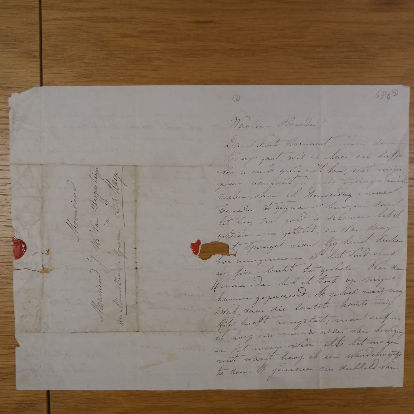 Vriend Jan! daar Verheull morgen naar den Haag vertrekt, zoo zal hij de goedheid hebben déze voor mij méde te némen; ik ben hier sints acht dagen en heb het genoegen met de jonge mevr Ulses en haar man te logéeren het spijt mij Verheull weder vertrekt, het is eene beste jongen: ik heb uw famille zeér wel verlaten,
