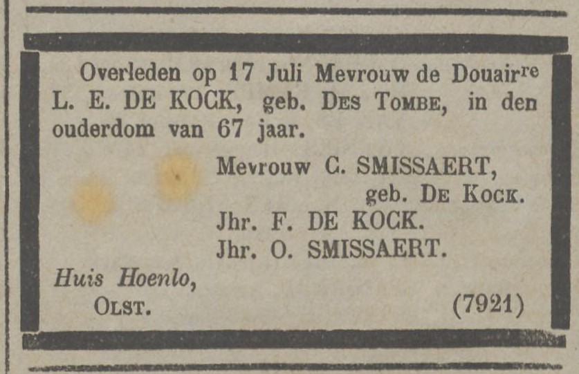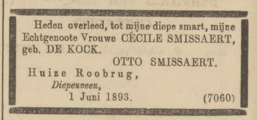 17 juli 1890 overleed de moeder van Cécile de Kock, Louise Elisabeth des Tombe.