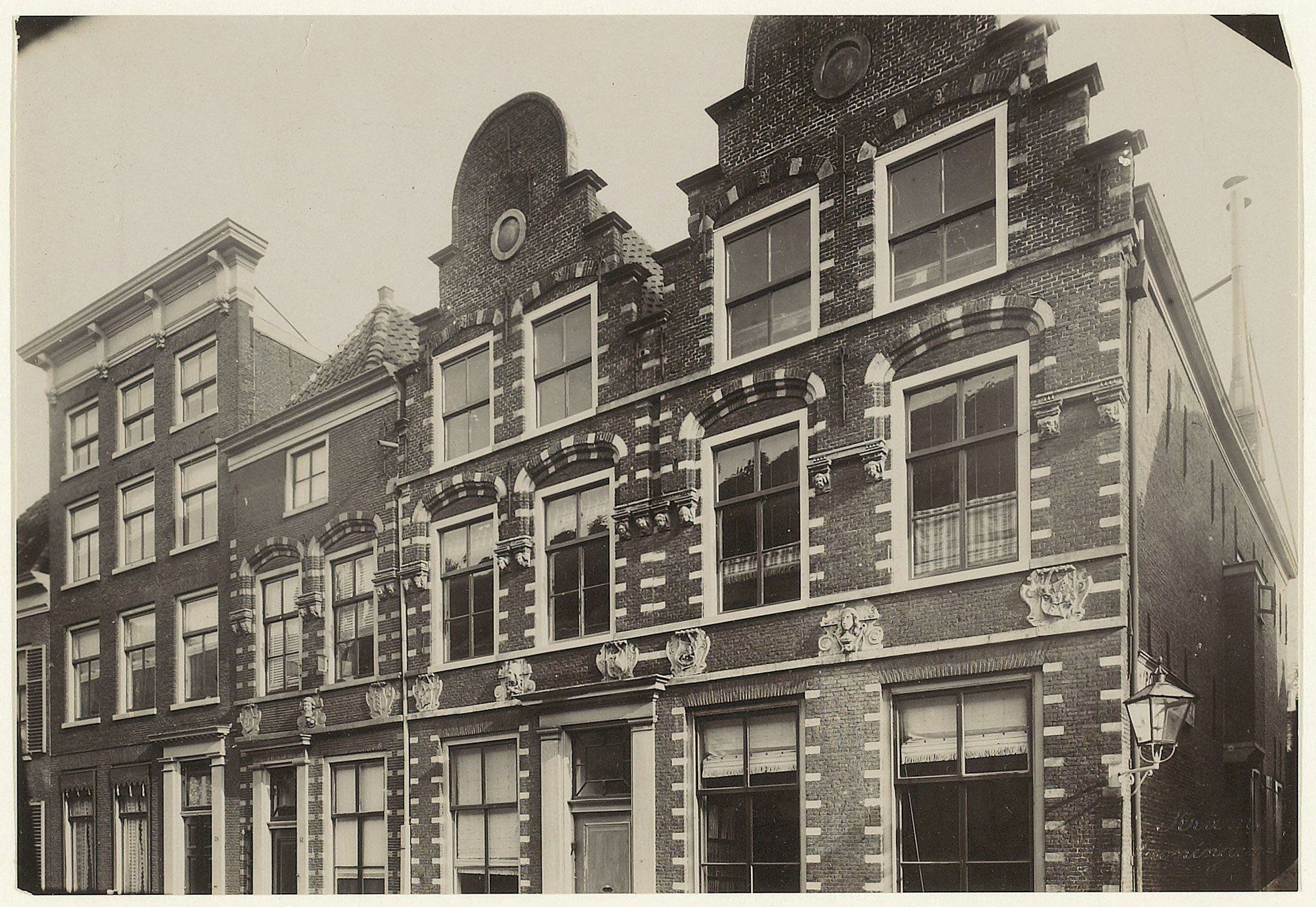 Het pand links heeft een lijstgevel, die in 1928 werd teruggerestaureerd naar de huidige trapgevel.