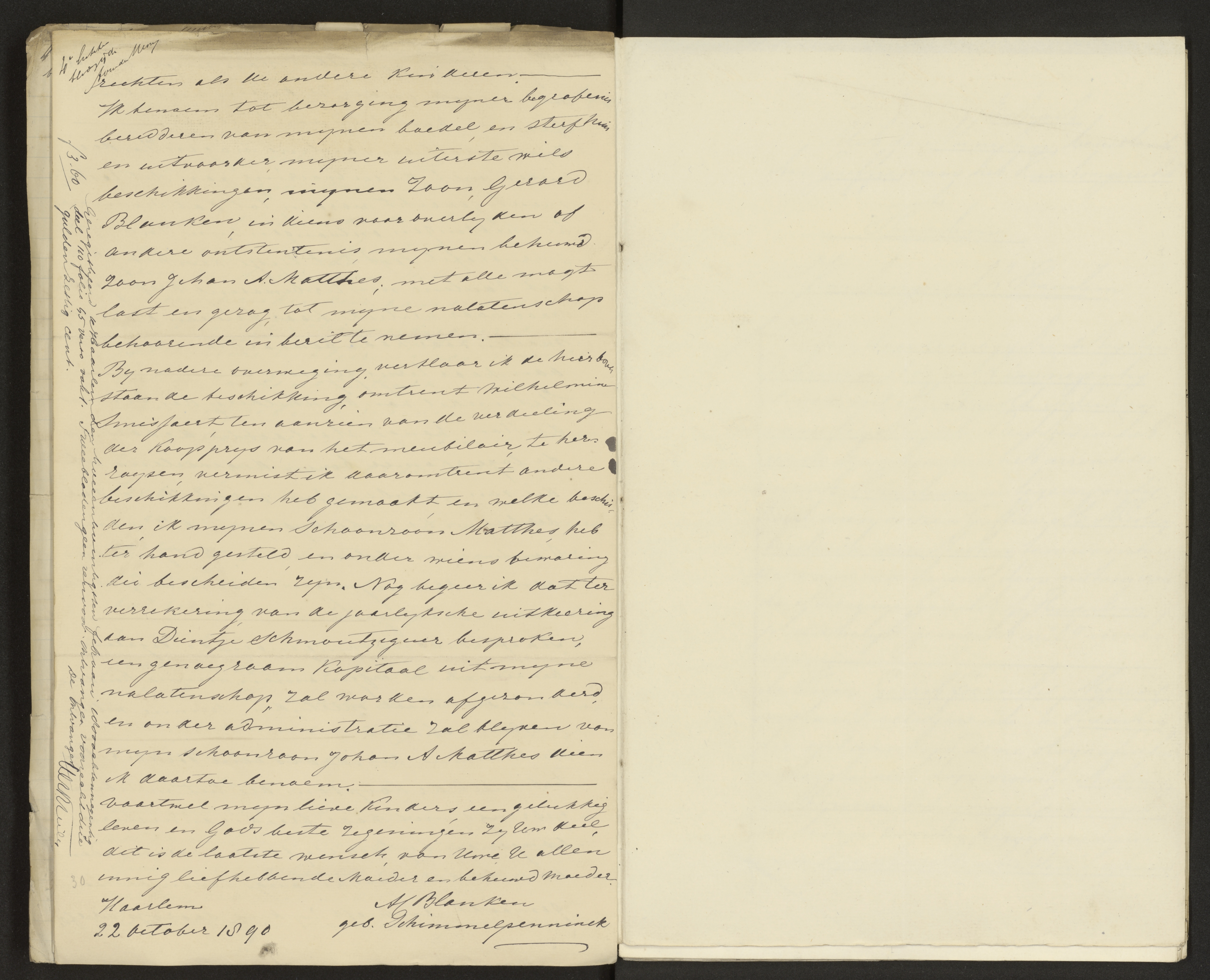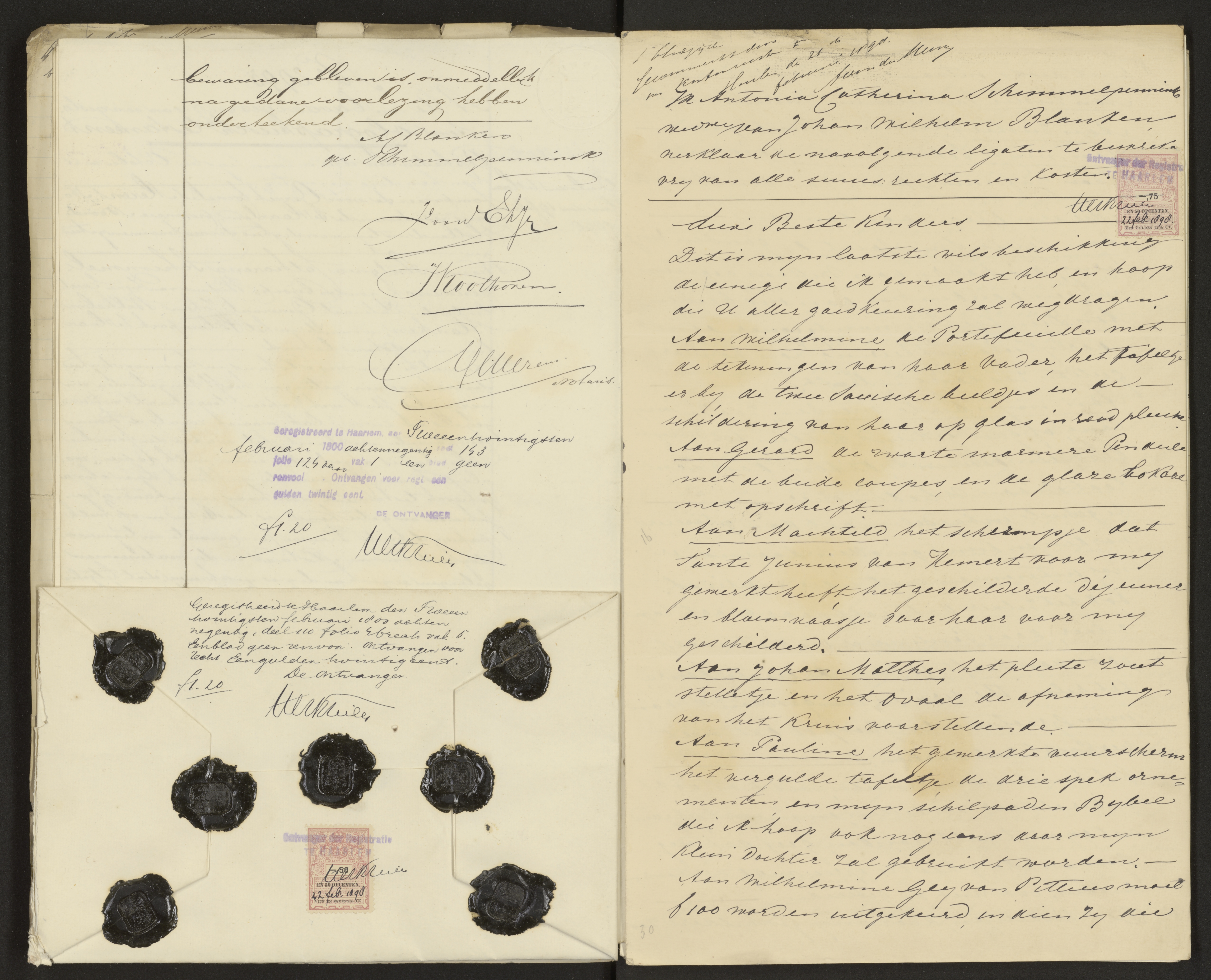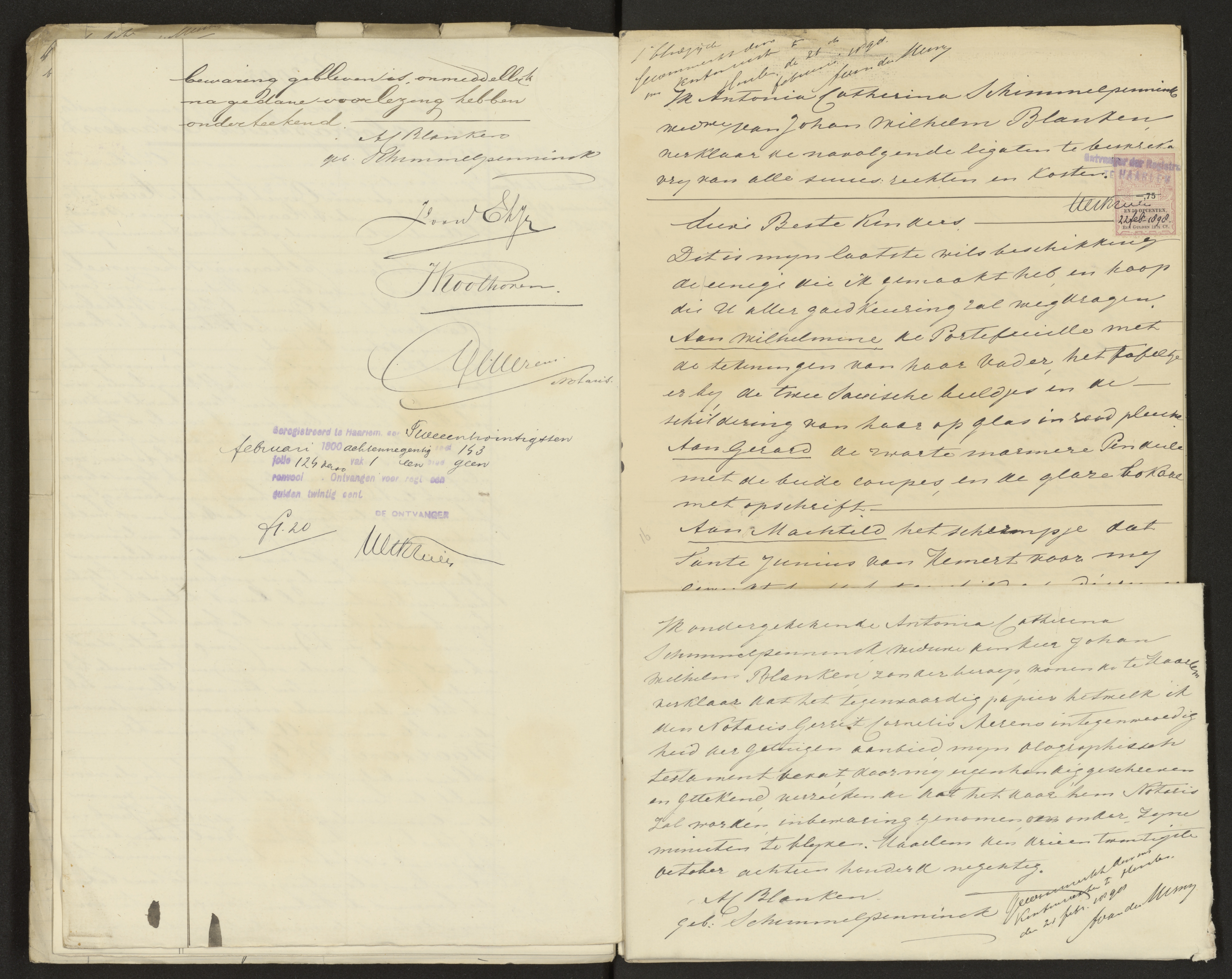 In 1890, acht jaar voor haar overlijden, schreef Antonia Catharina Schimmelpenninck haar testament. Hierin schreef ze dat ze Wilhelmine als haar eigen dochter beschouwde. Blijkbaar was het nodig dit op papier te zetten. Ook bleken zowel zij als haar man uit liefhebberij te schilderen. De schilderijen van Johan Wilhelm gingen naar Wilhelmina. Ze besloot dit olographisch testament ( zelfgeschreven testament, niet ten overstaan van de notaris opgemaakt, maar wel bij hem gedeponeerd) met de mooie woorden: 'Vaartwel mijn lieve kinders, een gelukkig leven en gods beste zegeningen zij uw veel, dit is de laatste wensch, van uwe u allen innig liefhebbende moeder en behuwd moeder.'