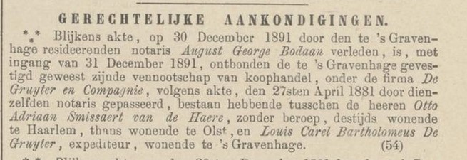 27 april 1881 richtte Otto Adriaan Smissaert van de Haere (Haarlem) samen met Louis Carel Bartholomeus de Gruyter (Den Haag) de firma 'De Gruyter en Compagnie' op, 'ten doel hebbende het emballeren en vervoeren van goederen en van hetgeen verder kan geacht worden daartoe te behooren'. De firma was gevestigd in Den Haag.
