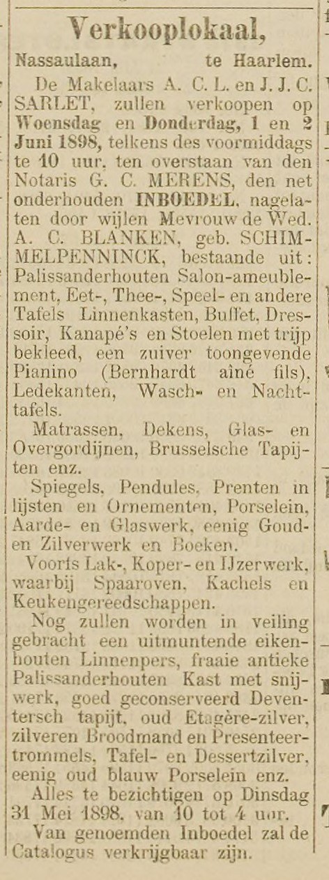 Otto Adriaan Smssaert, op dat moment wonende te Leiden, had hier in 1877 een ook villa gekocht, toen nog in aanbouw (hij ging er echter nooit wonen). Deze villa's werden gebouwd door de N.V. Haarlemsche Bouwvereeniging, opgericht in 1876 met als directie de heren Cornelis de Koning, koopman, Jan van de Vlugt, makelaar, en Louis Paul Zocher, architect. Zowel Otto Adriaan als Antonia Catharina Schimmelpennick hadden aandelen in deze N.V. Blanken - Schimmelpenninck kocht haar villa 27 augustus 1880 voor F 8874.