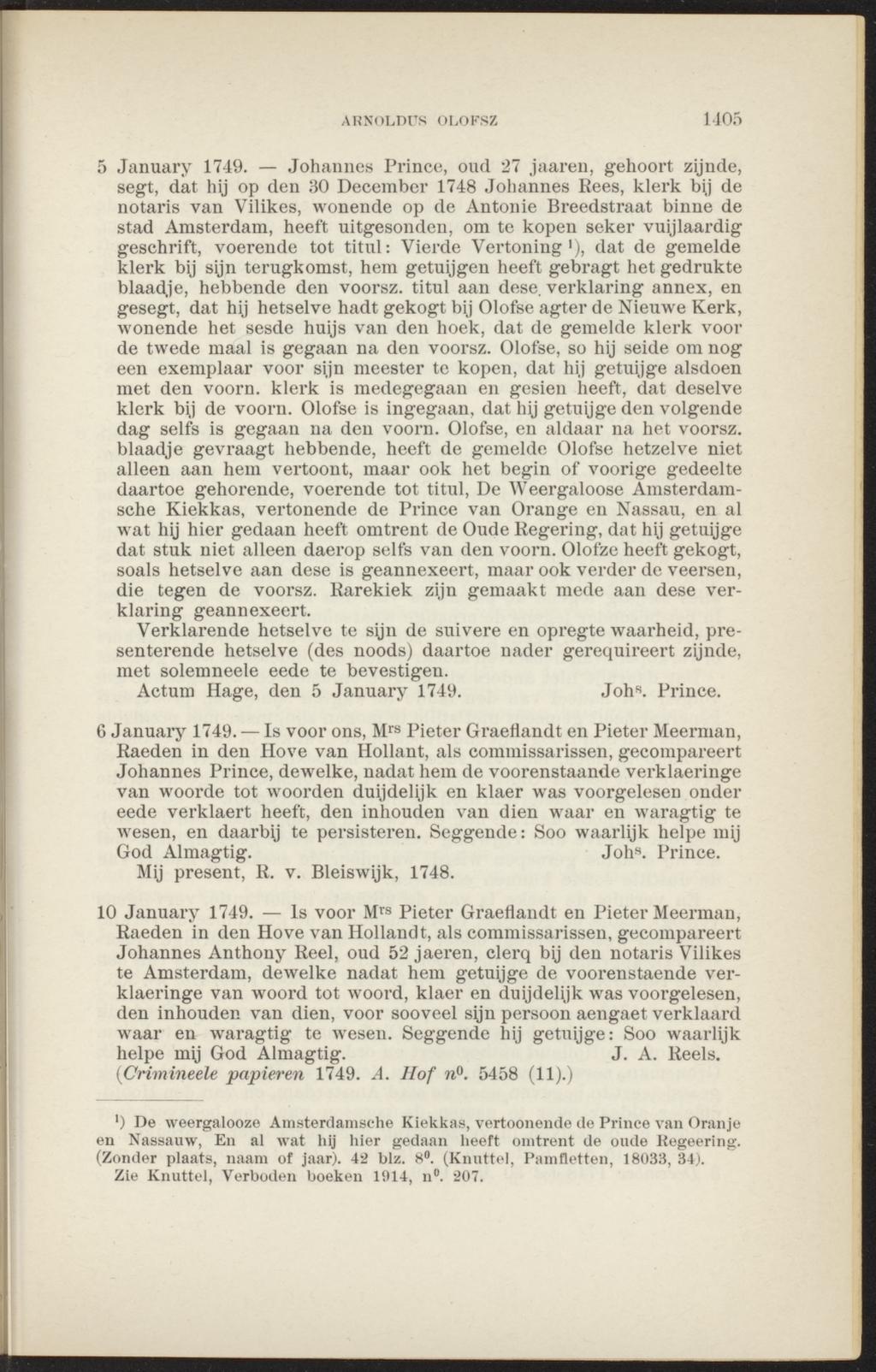 30 december 1748 koopt Johannes Prince, oud 27 jaaren, een 'seker vuijlaardig geschrift, voerende de titul: Vierde Vertoning'. Hij geeft de boekhandelaar, Arnoldus Olofsz. aan. Deze Arnoldus wordt 6 januari 1749 gevangen gezet in de Voorpoort in Den Haag, verschillende malen verhoord en bekent, zonder marteling ( 'buijten pijn en banden van ijser') de verkoper te zijn. Hij wordt veroordeeld tot drie jaar gevangenis op eigen kosten, en daarna eeuwige verbanning uit de landen van Holland, Zeeland, Vriesland en Utrecht. Ook zal het libel 'De Weergaloose Amsterdamsche Kiekas' in zijn bijzijn door de scherprechter worden verbrand. 18 oktober schrijft zijn vrouw aan de Prins van Oranje en Nassau met een verzoek om het vonnis nietig te verklaren (onder het Placaet van amnestie 1 oktober 1749). De prins keurt het goed. 18 november 1749 wordt Arnoldus uit de gevangenis ontslagen.