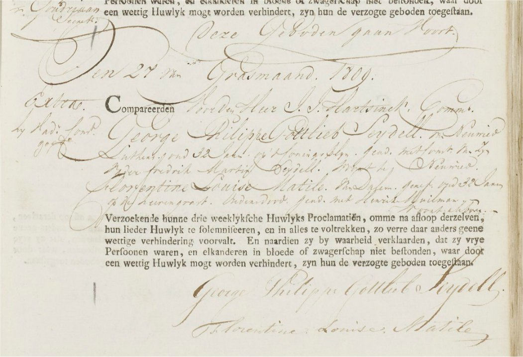 Inmiddels was mijn vriend Seydell, te Amsterdam, in het huwelijk getreeden met Mejufvrouw Matille, eene preedikants dochter uit Maastricht en tot hiertoe gouvernante bij den Heer Meulman. Doch, inplaats van zich ergens als kostschoolhouder te vestigen, in welke betrekking hij gewis uitneemend zou geslaagd zijn,