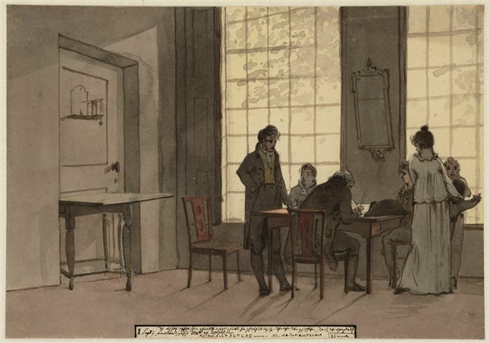 Tekeningen van Christiaan Andriessen. Hij gaf privéles als tekenleraar aan kinderen van rijke Amsterdamse families. De laatste tekening gaat over een huisconcert met de negen jongens van koopman Pieter de Haan. Het geeft een leuk inkijkje in het leven van een privé onderwijzer.